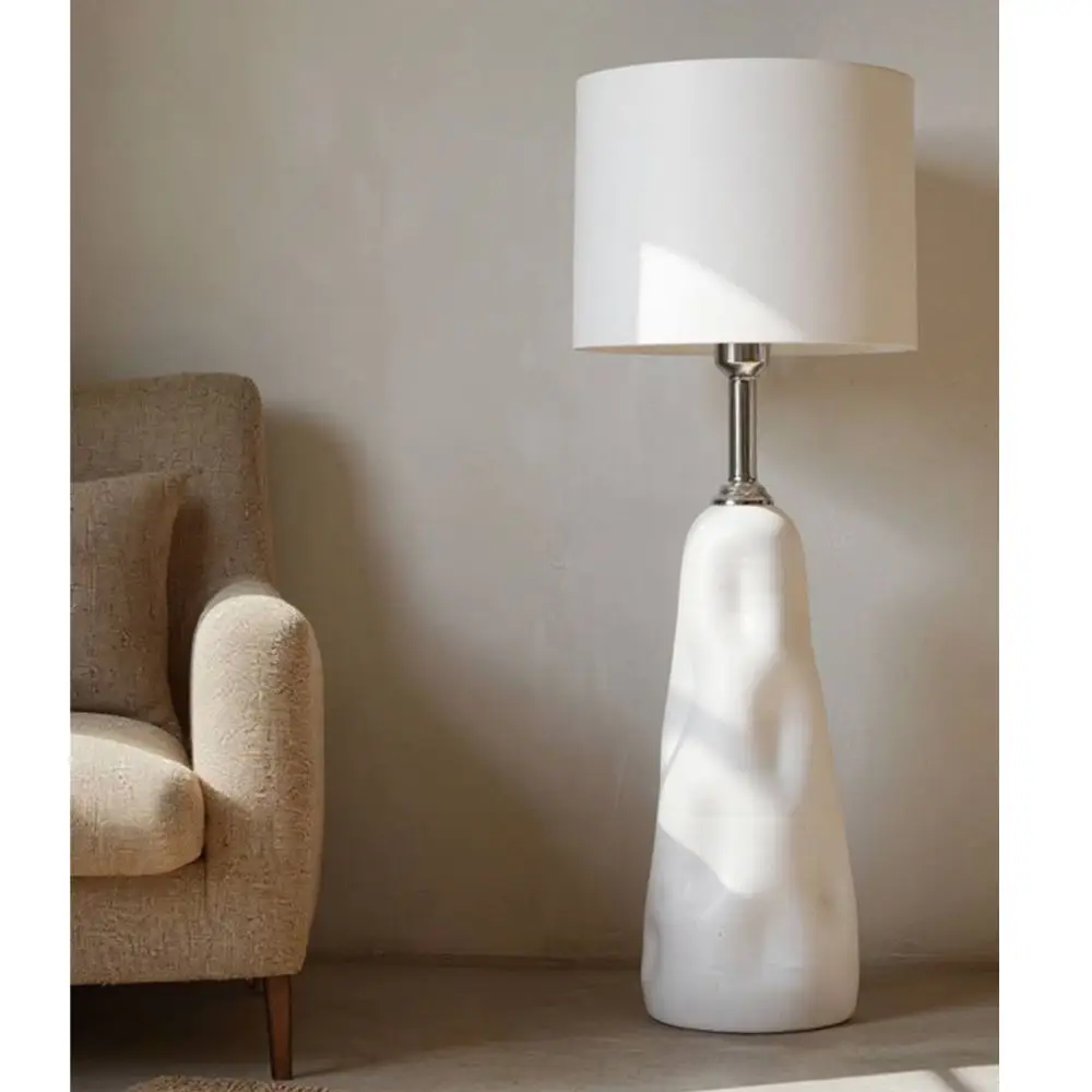 این مدل آباژور بلند از متریال با کیفیت ساخته شده و ترکیب پایه سنگی با کلاهک پارچه‌ای، ظاهری شیک و مقاوم به آن داده است. طراحی دفرمه باعث شده که بدنه آباژور شکل طبیعی و کمی نامنظمی داشته باشد که حس آرامش و زیبایی غیرقابل تکراری را منتقل می‌کند. همچنین، وزن مناسب و ابعاد بلند آن امکان استفاده در گوشه‌های مختلف منزل را فراهم می‌کند بدون این که فضا را اشغال زیاد کند.