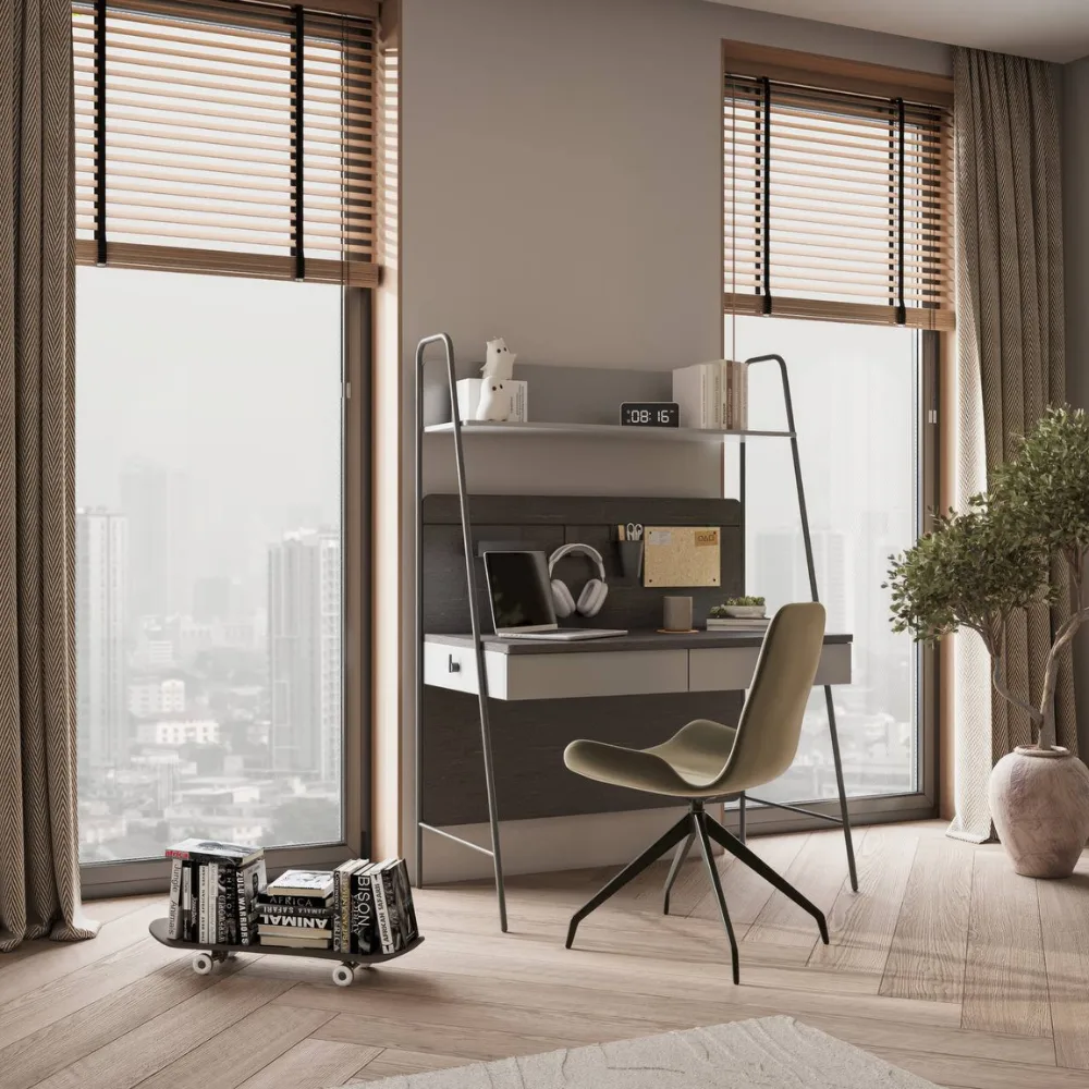 رنگ‌های طوسی و مشکی این میز تحریر، نمایی مدرن و جذاب به آن بخشیده و به راحتی با سایر وسایل اتاق نوجوانان هماهنگ می‌شود. این ترکیب رنگی، حس آرامش و انرژی مثبت را برای فضای کار و تحصیل نوجوان فراهم می‌کند.